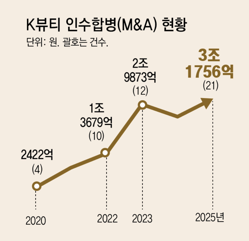 25일 중소기업 M&A 자문사 MMP에 따르면 올해 1∼10월 국내 화장품 업계에서 성사된 M&A는 총 21건으로, 거래액은 3조1756억 원으로 집계됐다. 지난해 2조5818억 원(18건) 대비 26.9% 증가한 규모다. 2017년 3조3312억 원 이후 8년 만에 3조 원을 넘어섰다.