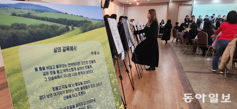 20일 부산 부산진구 부산여대 다촌문화관 1층 강당. ‘길’이라는 제목의 작품이 올려진 이젤 앞에서 박양덕 씨(72)는 “시를 쓰면서 풋풋했던 소녀 시절로 돌아간 듯했다”며 수줍게 웃었다. 이날 강당에선 부산여대 사회복지학부 소속 성인 학습자(만학도) 20여 명이 쓴 시를 전시하는 시화전이 열렸다. 지난해 자전적 수필인 ‘쉿! 내 안의 숨은 페이지들’을 펴내며 수필 작가가 돼 본 이들이 올해는 시인으로 나선 것이다.