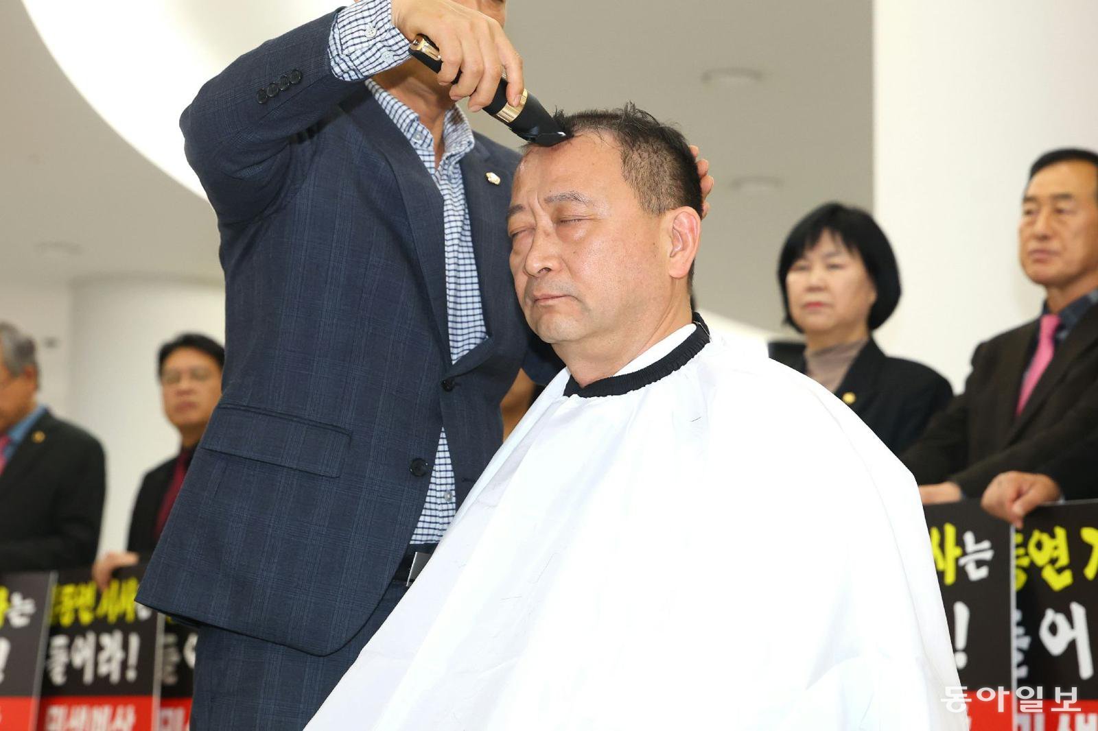 경기도의회 국민의힘 백현종 대표의원(구리1)이 25일 조혜진 경기도지사 비서실장과 보좌진에 대한 전원 파면을 요구하며 삭발하고 있다. 국민의힌 제공