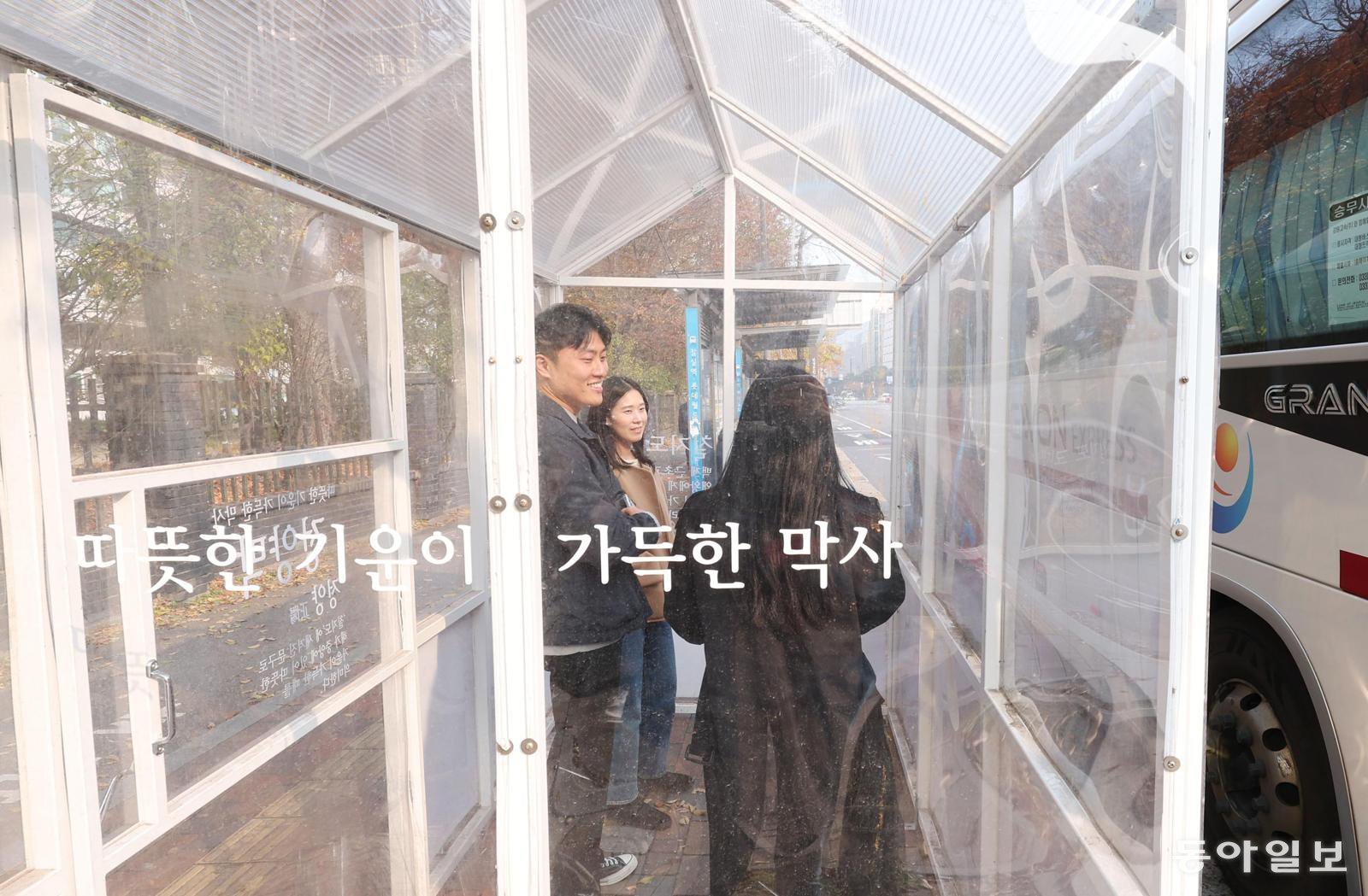 25일 서울 송파구의 한 버스정류장에서 시민들이 버스를 기다리고 있다. 송파구는 겨울철 한파에 대비해 버스정류장 25곳에 바람막이 시설 ‘정양막’을 설치했다. ‘정양막’은 백제 한성도읍기 유물인 칠지도에 새겨진 ‘정양(正陽·따뜻하고 밝은 기운)’ 문구에서 이름을 따왔다.