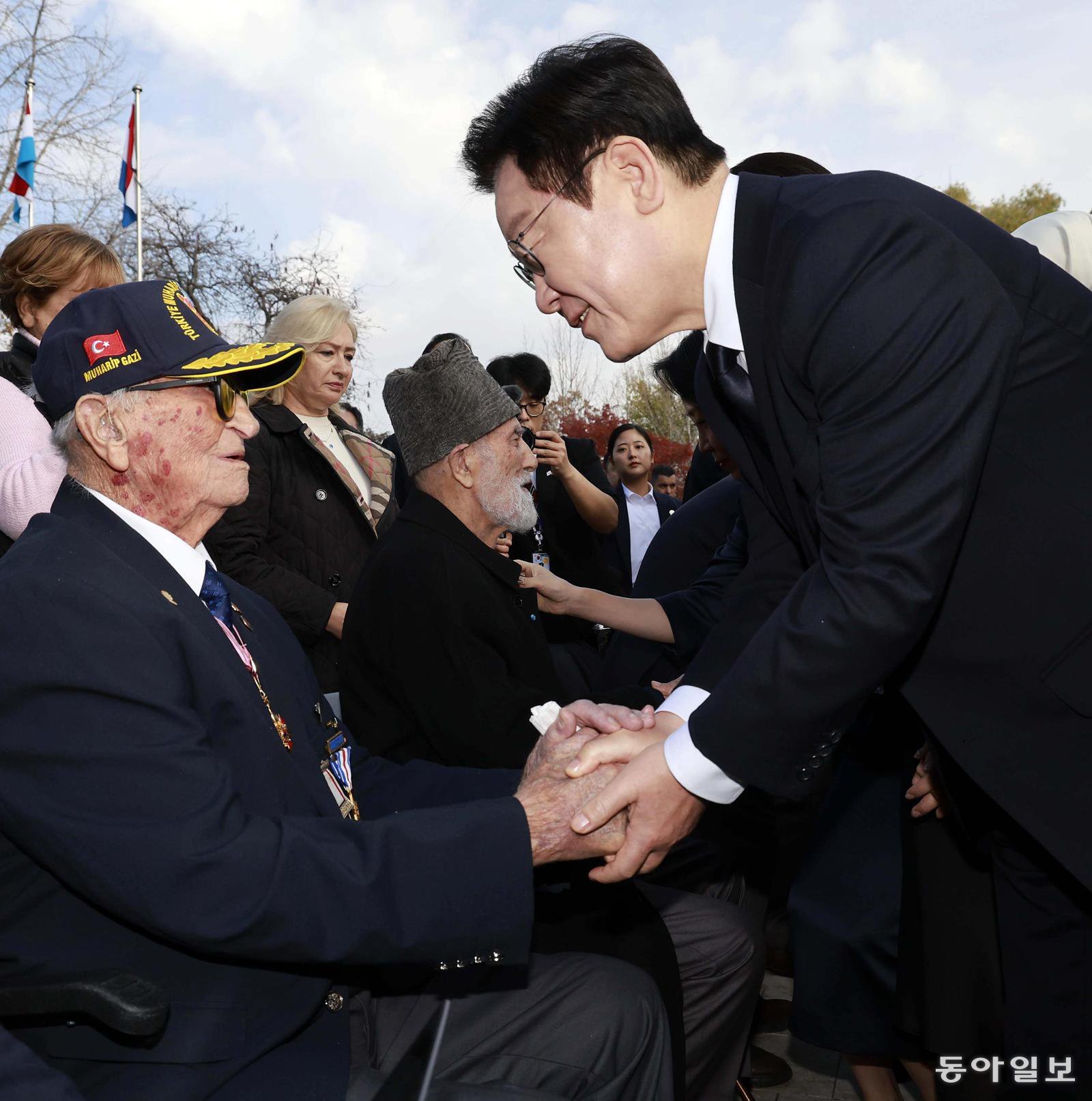 튀르키예를 국빈 방문 중인 이재명 대통령이 25일(현지시간) 앙카라 한국전 참전 기념탑 헌화를 마치고 참전용사들과 인사하고 있다. 앙카라=송은석 기자 silverstone@donga.com