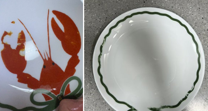 작성자 A 씨는 “설거지를 하고 보니 빨간색(랍스터 그림)은 완전히 사라졌고, 녹색 테두리도 없어지기 시작했다”며 “지워진 모양을 보면 물리적으로 긁힌 게 아니라 녹아내린 것처럼 사라지고 있다”고 말했다. 이어 “써브웨이 랍스터 접시에 뭐 먹지 말라. 잉크가 벗겨진다”고 당부했다.