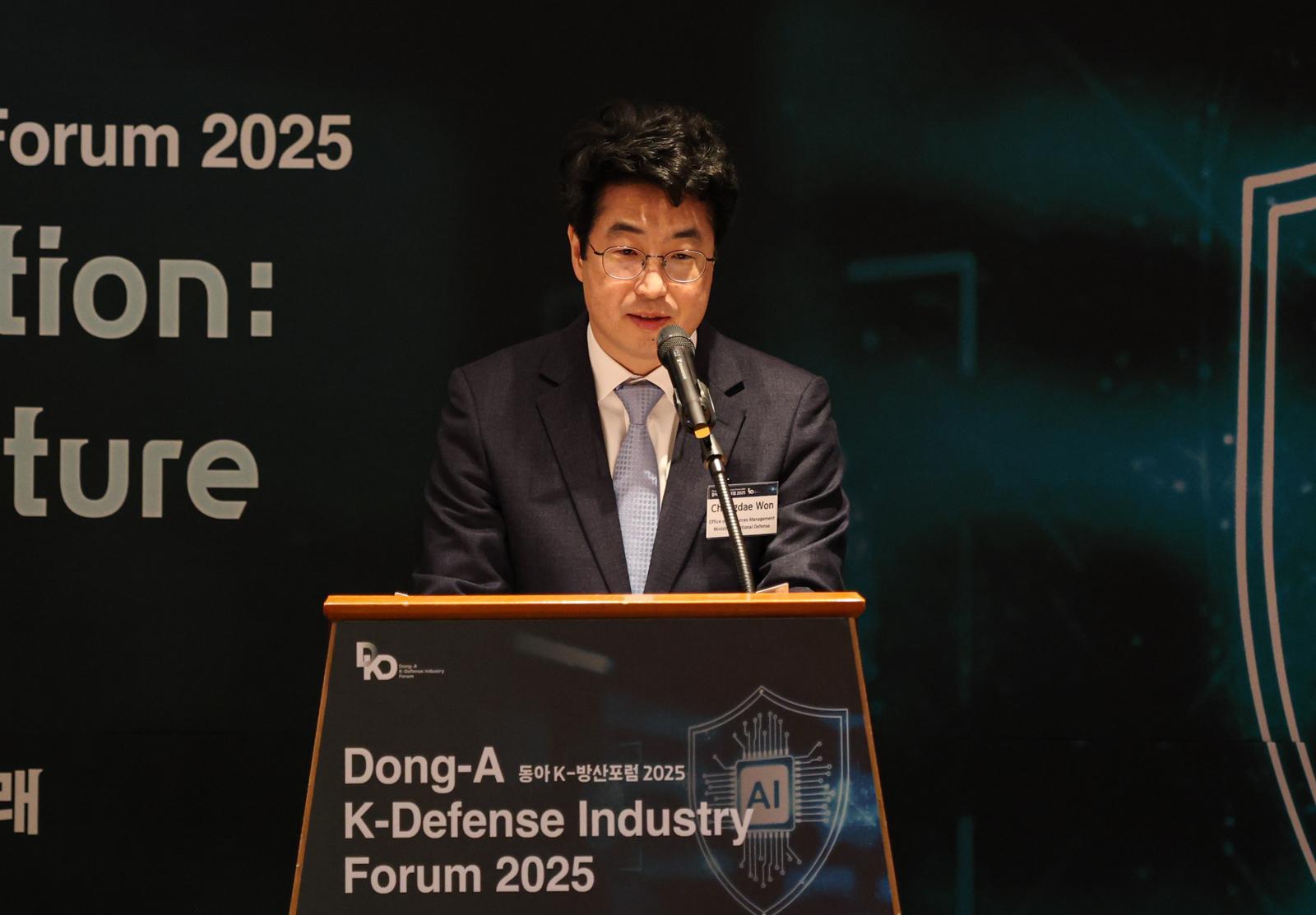 25일 서울 중구 롯데호텔에서 열린 동아 K-방산포럼 2025에서 원종대 국방부 자원관리실장이 안규백 국방부 장관의 축사를 대독하고 있다. 이한결 기자 always@donga.com