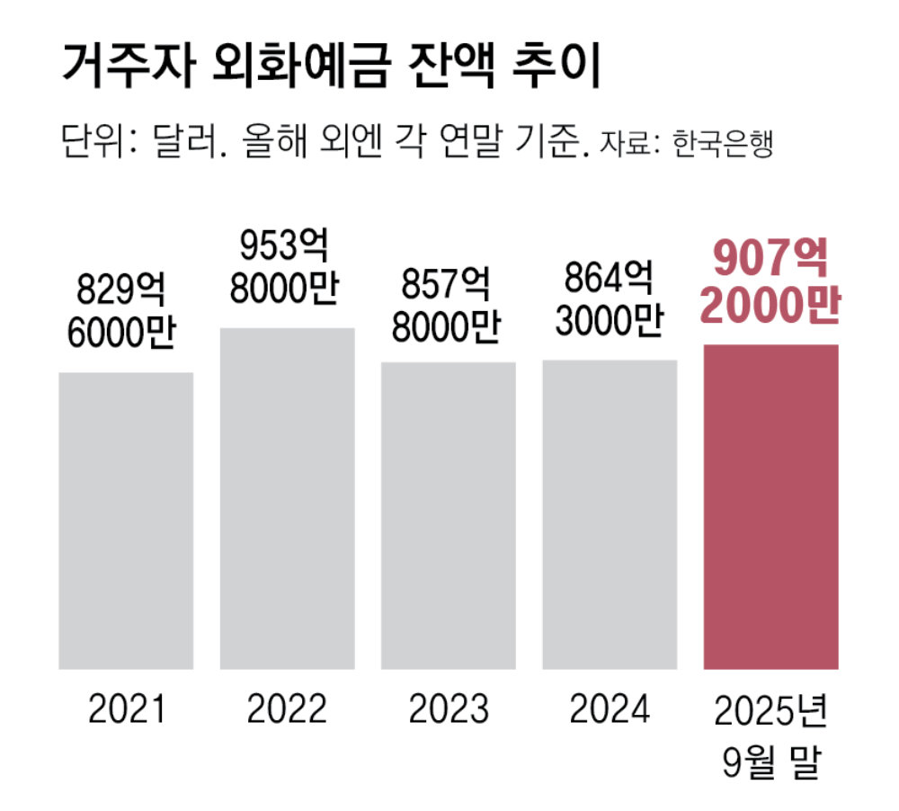 환율 고공 행진에 외화 자산에 대한 수요는 다시금 불붙고 있다. 5대 은행에서 달러 예금은 21일 기준 613억 달러(약 90조2581억 원)로 전월 말 대비 40억 달러가량 증가했다. 전년 11월 말(604억 달러)보다도 많다. 달러 예금은 9, 10월 감소세를 보였는데 환율이 치솟은 이달 들어 다시 늘었다.