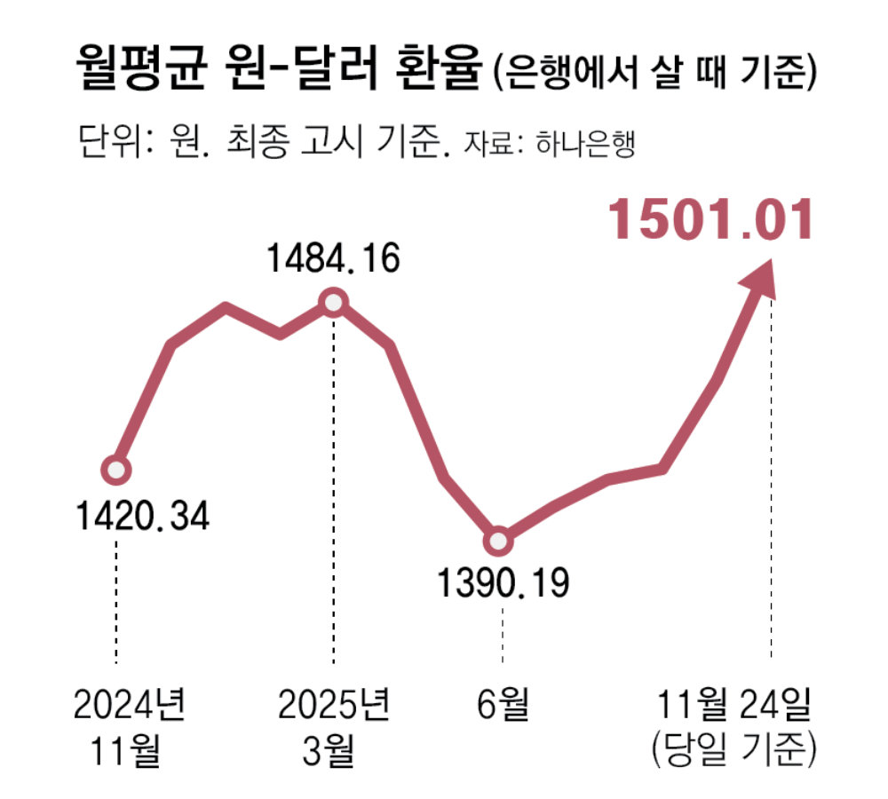 5대 시중은행(KB국민·신한·하나·우리·NH농협)에서 이날 달러화를 살 때 원-달러 환율은 장중 1500원을 넘어섰다. 일선 은행 영업점에서 달러를 사고팔 때는 영업 비용이 반영돼 매매 기준율 대비 1.75%가 가산된다. 은행에 따라 20일 또는 21일 달러를 살 때 환율이 1500원을 넘어선 뒤 등락을 계속하고 있다. 환율은 도널드 트럼프 미국 대통령의 상호관세 정책이 발표된 4월에 1500원을 돌파한 바 있는데, 7개월여 만에 다시 치솟은 것이다.