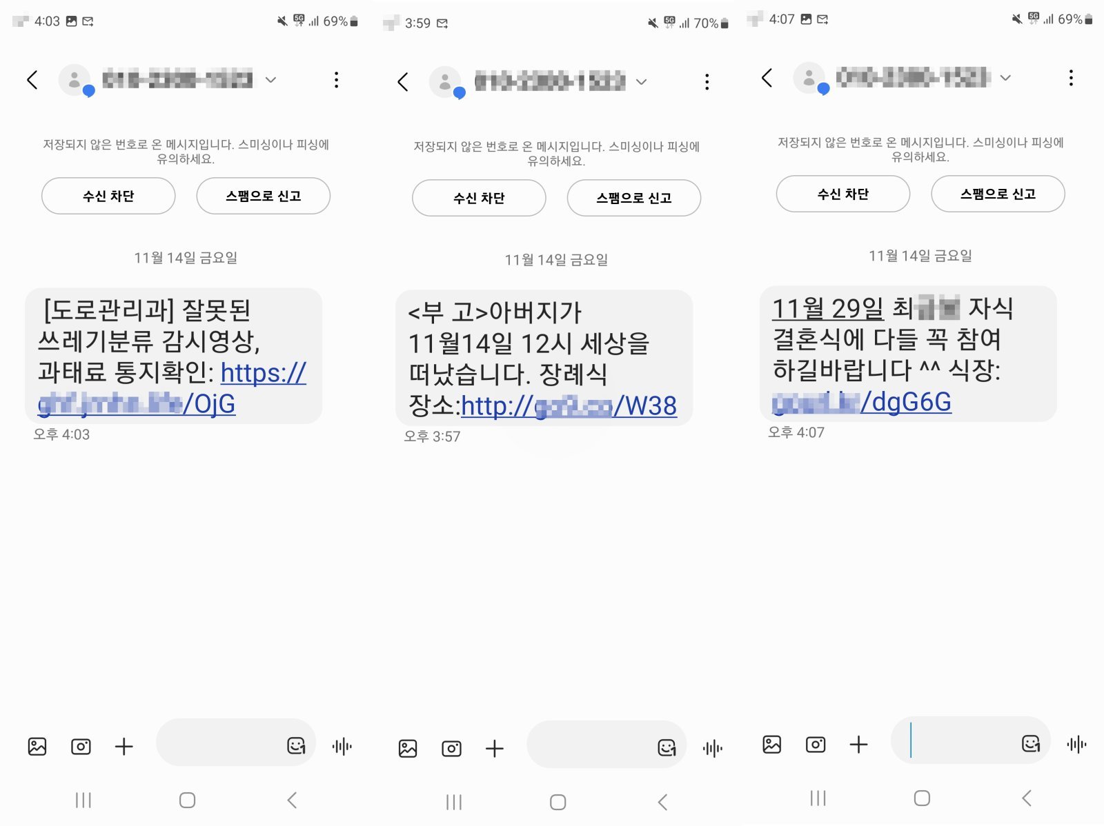 이들은 2023년 7월부터 올해 6월까지 청첩장과 부고장, 교통법규 위반 안내 등으로 위장한 문자에 악성앱 설치 링크를 포함해 보내는 수법으로 범행을 이어왔다.