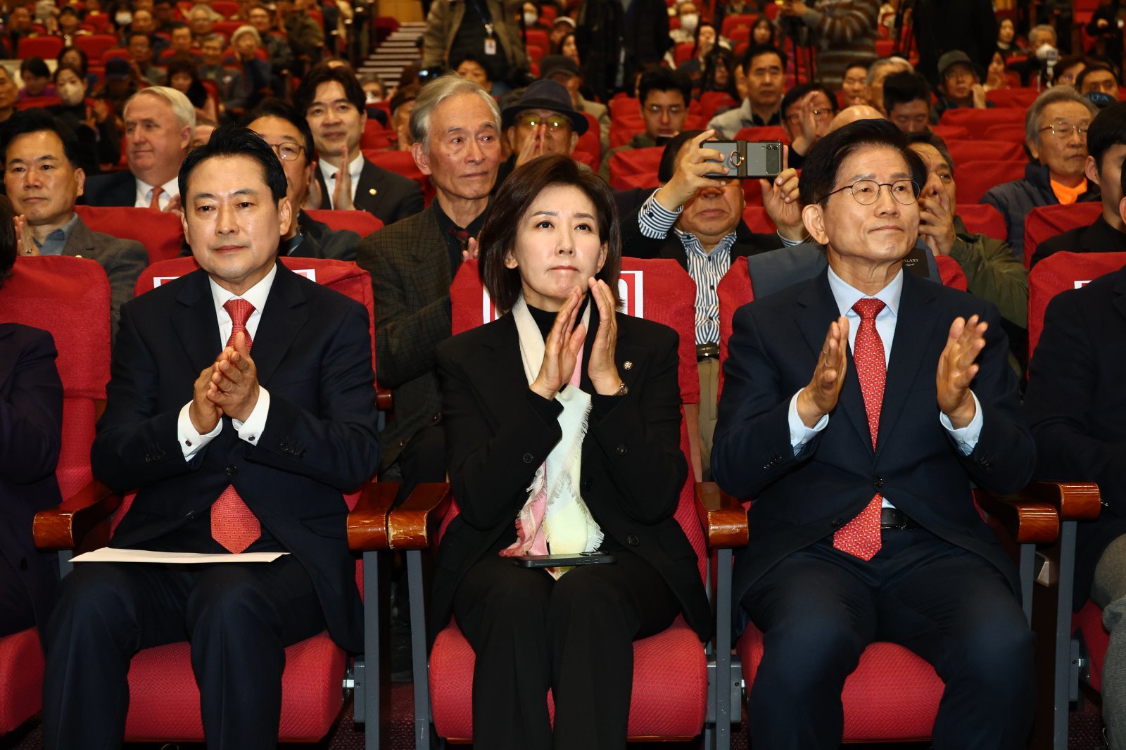 [서울=뉴시스] 김명년 기자 = 장동혁(왼쪽부터) 국민의힘 대표와 나경원 의원, 김문수 전 대선후보가 26일 오전 서울 여의도 국회 의원회관에서 열린 ‘1905-1945 독립외교 40년 이승만의 외로운 투쟁’ 시사회에서 박수치고 있다. 2025.11.26 뉴시스