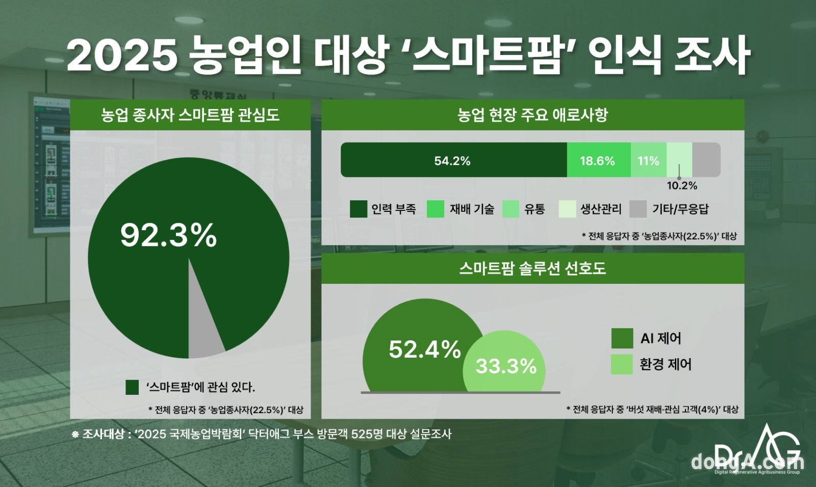 스마트팜 전문기업 닥터애그는 26일 ‘2025 국제농업박람회’에서 부스를 방문한 525명을 대상으로 스마트팜 인식 조사를 실시한 결과, 농업 종사자의 92.3%가 스마트팜 도입 필요성에 공감했다고 밝혔다. 그러나 실제로 자동화된 스마트팜 시스템을 운영하고 있다는 응답은 37.3%에 그쳐 상당한 잠재 수요가 존재함을 보여줬다고 설명했다.