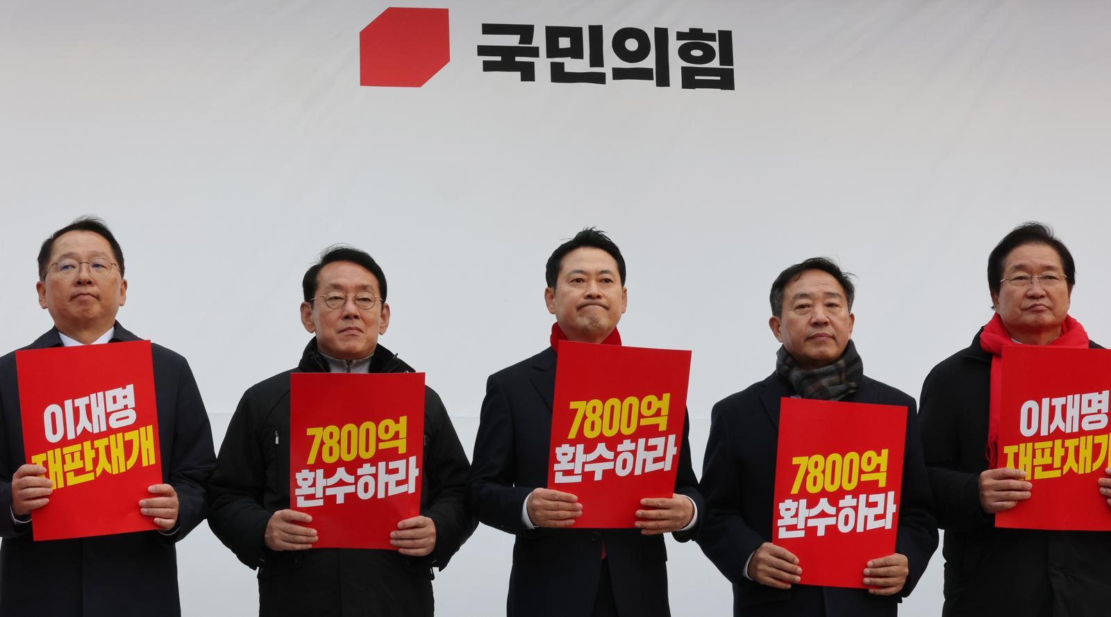 장동혁 국민의힘 대표가 26일 충남 천안시외버스터미널 앞에서 열린 민생회복 법치수호 국민대회에 참석해 당직자들과 이재명 대통령 재판 재개 촉구, 7800 환수 촉구 피켓을 들고있다. 2025.11.26/뉴스1