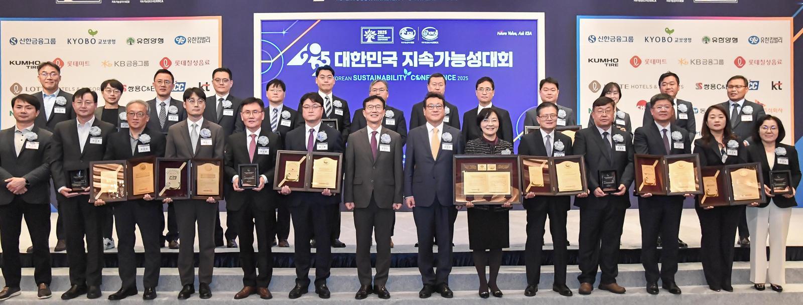 26일 서울 중구 소공동 롯데호텔에서 열린 ‘2025 대한민국 지속가능성대회’에서 수상자들이 기념 촬영을 하고 있다. 앞줄 왼쪽부터 홍성호 동아오츠카 상무, 장승호 KB증권 전무, 오태성 KT 실장, 백승근 KCC 상무, 서성철 교보증권 부사장, 김경배 교보생명 전무, 문동민 한국표준협회 회장, 김재구 명지대 교수, 이은하 신한금융그룹 부장, 이현준 쌍용C&E 대표집행임원 사장, 박철호 동아오츠카 대표이사 사장, 신가균 인천국제공항공사 본부장, 전양숙 유한킴벌리 상무, 김경남 KB금융그룹 상무.