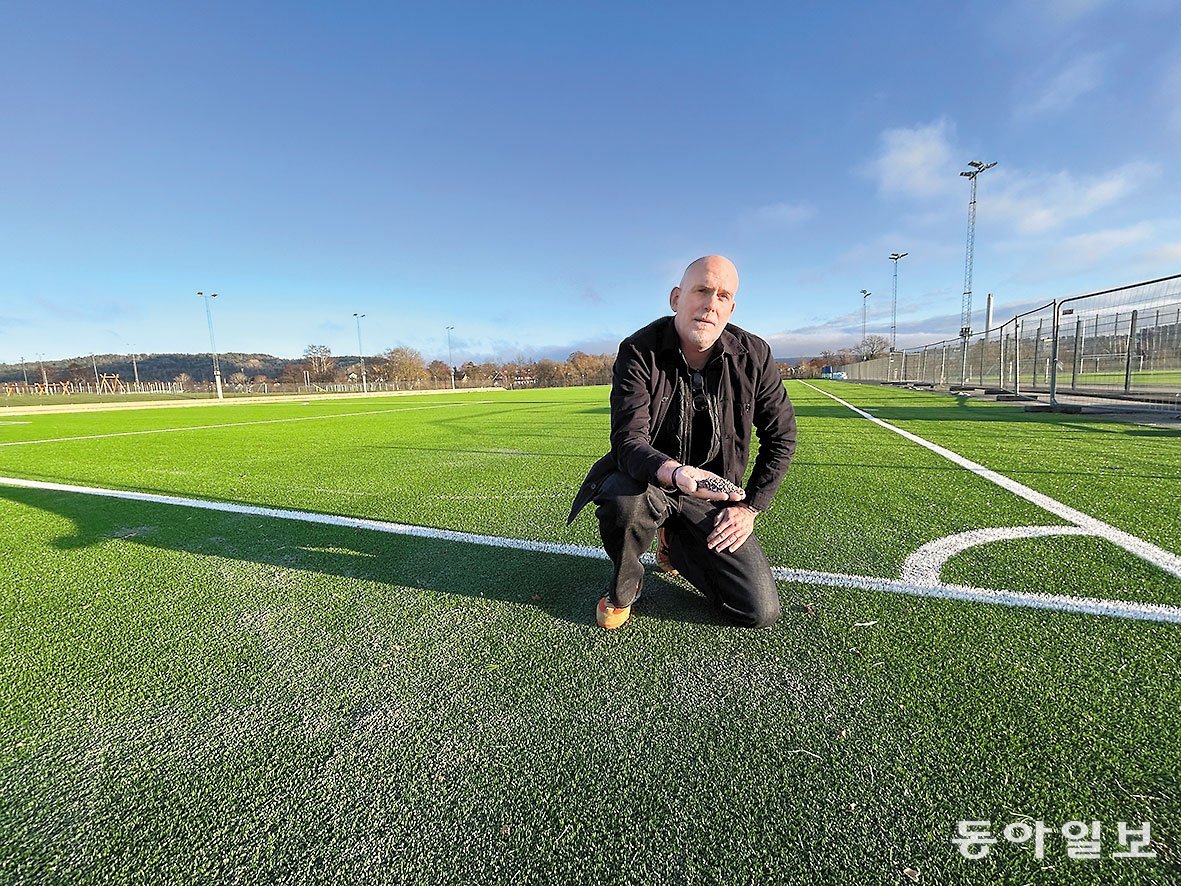 바이오 신소재 개발기업 BIQ의 예르케르 푼네마르크 대표가 25일 스웨덴의 한 축구 경기장에서 CJ제일제당의 생분해성 바이오 소재 ‘PHA’를 활용해 만든 친환경 인조 잔디 충전재에 대해 설명하고 있다. 예테보리=유근형 특파원 noel@donga.com