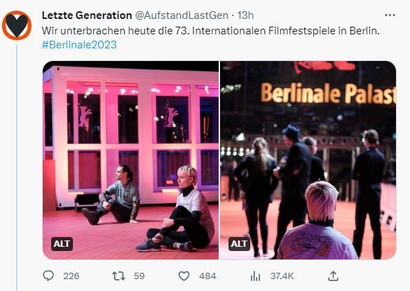 2023년 73회 베를린영화제에서 기후운동단체 ‘마지막세대’ 소속 활동가들이 손에 접착제를 바른 뒤 항의 시위를 벌이고 있다. 마지막세대 SNS 캡쳐