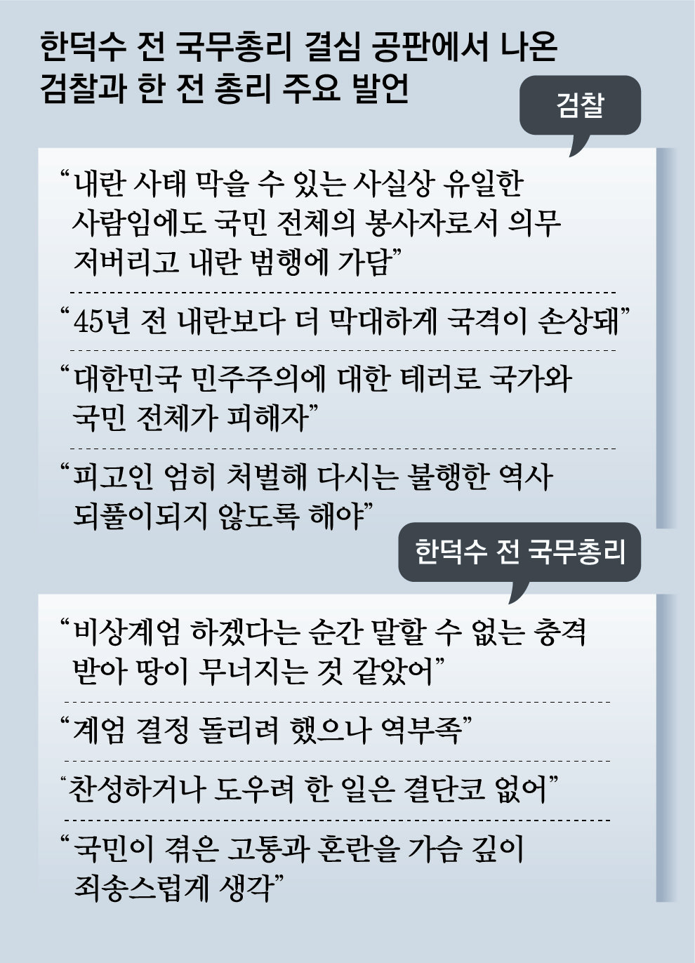 특검은 “(12·3 비상계엄은) 수십 년간 쌓은 민주화 결실을 한순간에 무너뜨리고 국가경쟁력을 추락시킨 사건이다. 국민의 충격과 트라우마도 여전하다”며 한 전 총리를 비롯한 관계자에 대한 엄벌 필요성을 강조했다.