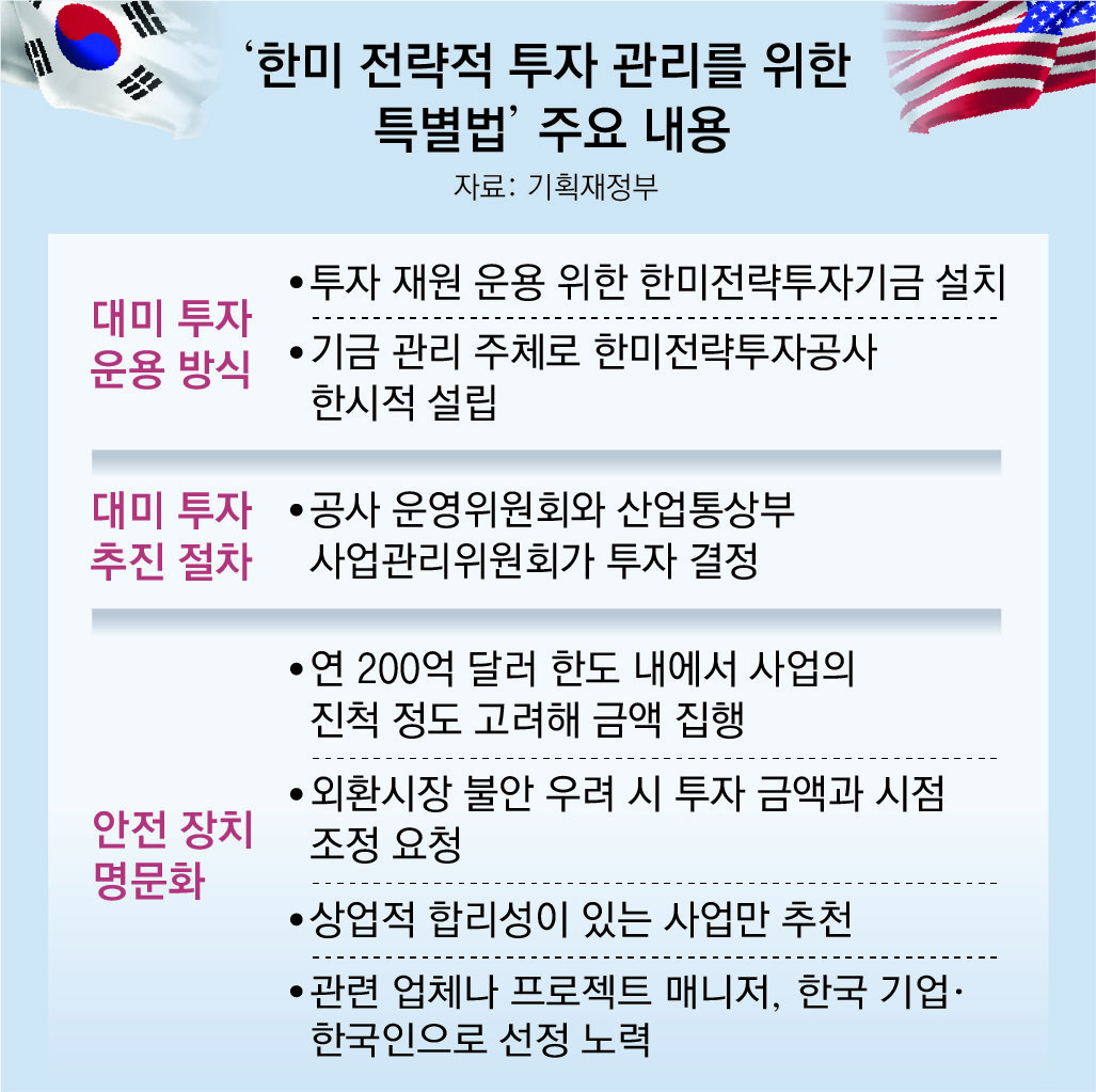 특별법은 ‘한미 전략적 투자에 관한 양해각서(MOU)’에 명시된 안전장치도 명문화했다. 연 200억 달러의 송금 한도에서 사업 진척 정도를 고려한 금액을 집행하도록 했다. 대미 투자가 외환시장의 불안을 야기할 우려가 있다면 투자 금액과 시점의 조정을 요청해야 한다.