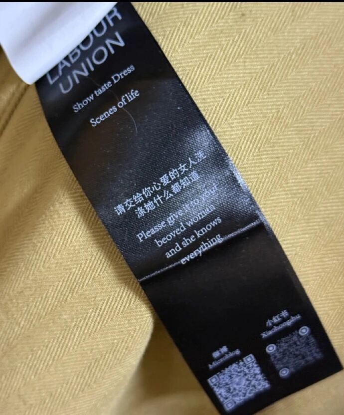 옷 라벨에는 “당신이 사랑하는 여자에게 이 옷을 맡기세요, 그녀는 모든 것을 알고 있습니다”라는 문장이 중국어와 영어로 적혀있다. 영어 문장에는 ‘beloved(사랑하는)’가 ‘beoved’로 적혀있는 등 오자도 눈에 띈다.
