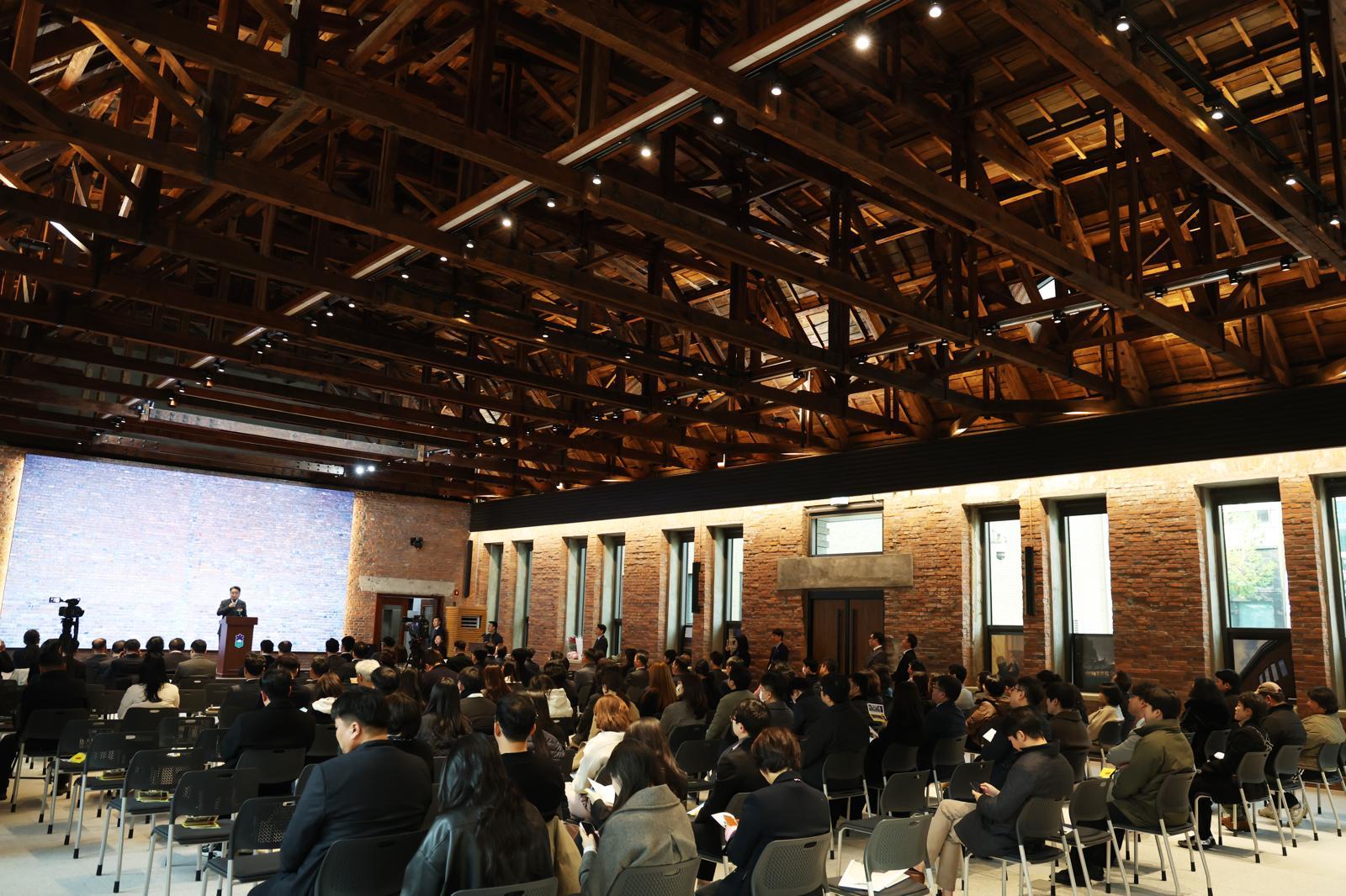 충북도는 1953년 준공된 도청 대회의실을 복합문화공간으로 전면 개보수해 27일부터 도민들에게 선보였다. 사진은 이날 개관식에 축사를 하는 김영환 충북지사. 충북도 제공또 천장 속 네 개의 천창을 복원해 자연광이 실내로 유입되도록 했고, 갤러리형 창문도 당시 디자인과 디테일을 살려 공간의 완성도를 높였다. 기존 회의 기능 중심 공간은 회의·전시·공연·소규모 연회 등 다양한 활용이 가능한 다목적 문화공간으로 재구성됐다. 도청 중정(中庭)에 조성된 ‘문화광장 815’와도 연결돼 실내외가 자연스럽게 이어지는 개방형 문화 동선을 완성했다.