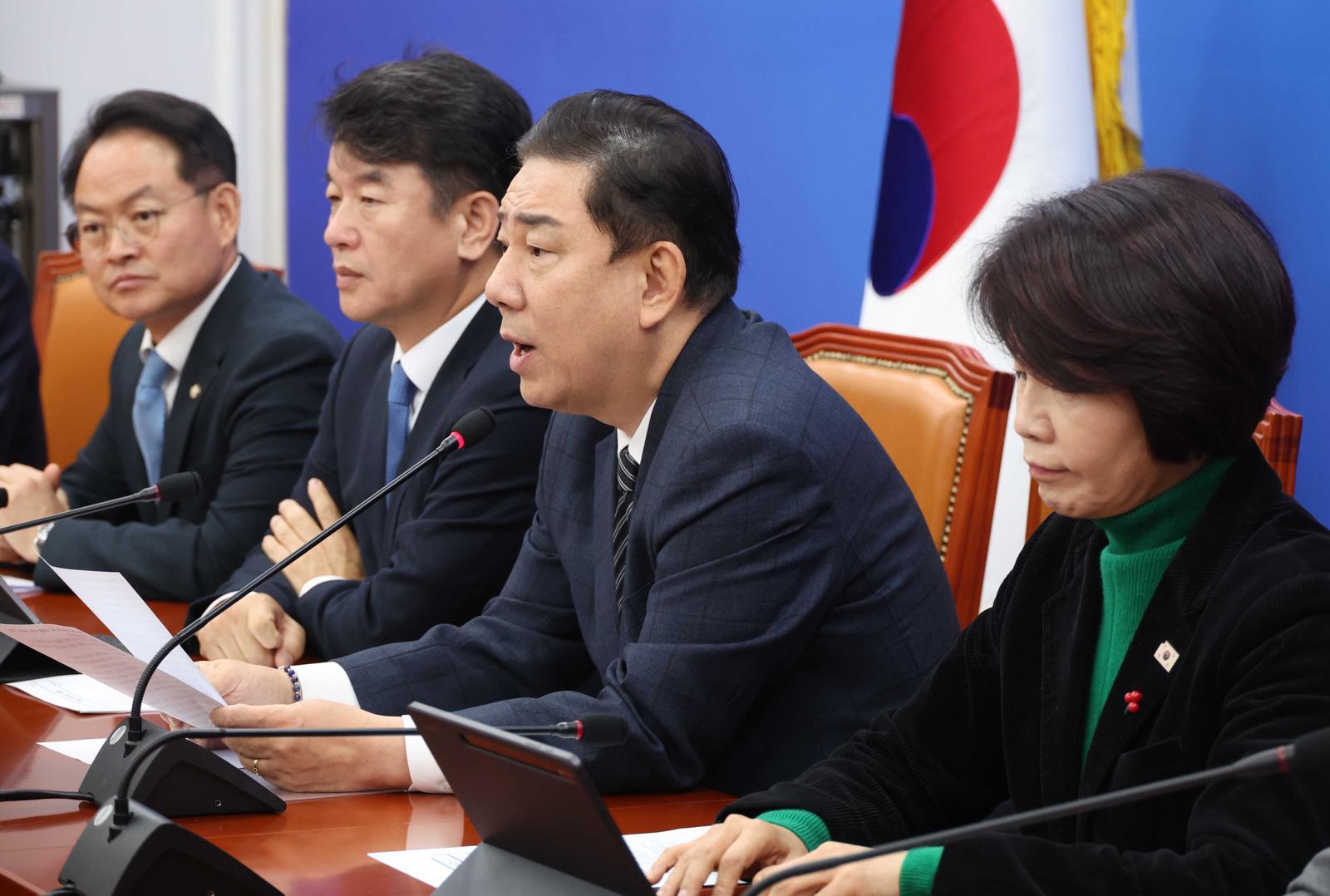 [서울=뉴시스] 조성봉 기자= 김병기 더불어민주당 원내대표가 27일 오전 서울 여의도 국회에서 열린 정책조정회의에서 발언을 하고 있다. 2025.11.27. suncho21@newsis.com