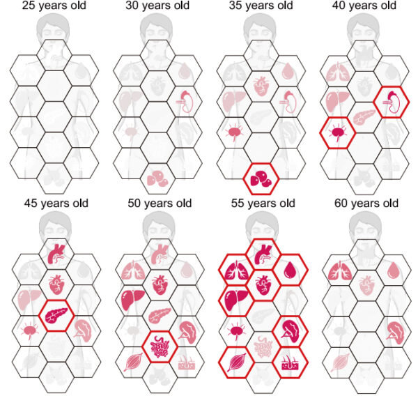 조직과 장기의 노화 속도는 이 시기에 이전 수십 년보다 훨씬 가팔라지며, 그중에서도 대동맥이 가장 빨리 쇠퇴하는 것으로 나타났다. 대동맥은 심장에서 나온 피를 온몸에 공급하는 중요 혈관이다.