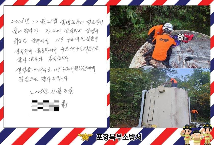 경북 포항에서 물탱크를 청소하던 도중 가스 질식 사고를 당한 70대 남성이 자신을 구조해 준 소방대원들에게 자필 감사 편지를 전해 감동을 안겼다.