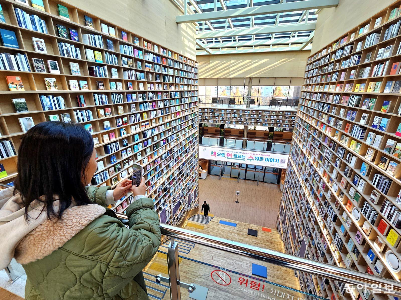 천장까지 이어지는 책장, 사진으로 남길 만하네