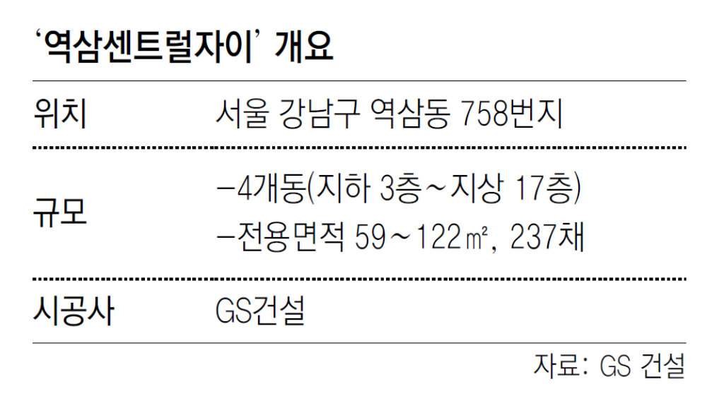 GS건설은 강남구 역삼동 758번지 일원 역삼동 주택재건축정비사업을 통해 ‘역삼센트럴자이’를 12월 분양할 예정이라고 27일 밝혔다. 단지는 4개동(지하 3층∼지상 17층), 전용면적 59∼122㎡ , 총 237채 규모다. 이 중 87채가 일반분양으로, 전용면적별 물량은 △59㎡ 10채 △84㎡A 42채 △84㎡B 13채 △84㎡C 11채 △84㎡D 5채 △122㎡ 6채다.