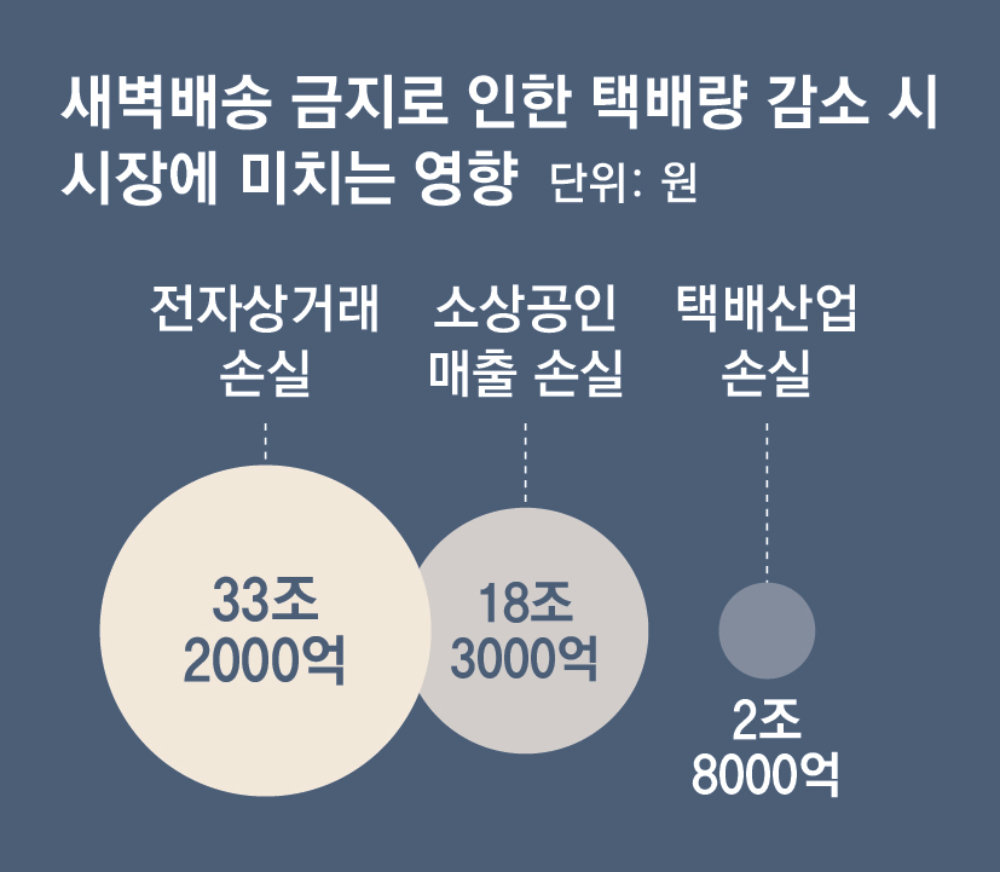 새벽배송이 금지될 경우 연간 50조 원이 넘는 손실이 발생할 수 있다는 주장도 나왔다. 국내 최대 물류산업 학회인 한국로지스틱스학회는 ‘새벽배송과 주 7일 배송의 파급효과 관련 연구’ 보고서를 통해 “새벽배송과 주 7일 배송이 중단돼 택배 주문량이 약 40% 감소하면 연간 54조3000억 원의 손실이 발생할 것”이라고 주장했다. 손실 규모는 전자상거래가 33조2000억 원으로 가장 클 것으로 예측됐고, 소상공인 피해 예상액은 18조3000억 원으로 추산됐다.