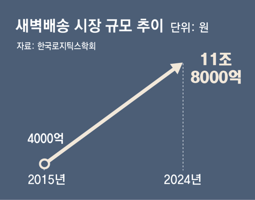 새벽배송 시장 규모는 2015년 4000억 원에서 지난해 11조8000억 원으로 급속히 성장했다. 이커머스의 성장과 맞벌이 가정, 1인 가구 등의 수요가 맞물린 결과다.