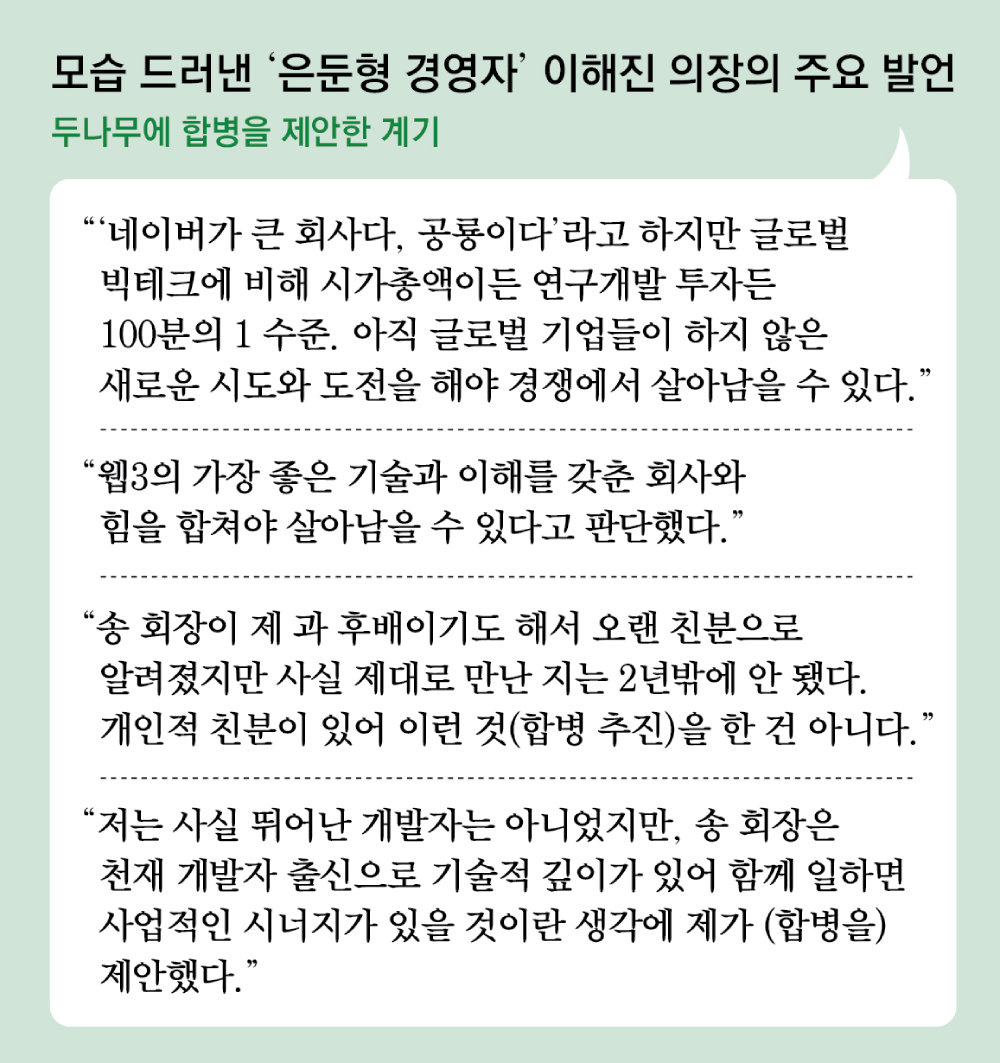전날 3사가 네이버파이낸셜과 두나무 양사의 합병안을 의결한 데 이어 이날 이 의장은 “글로벌 기업들이 하지 않는 새로운 시도와 도전을 해야 경쟁에서 살아남을 수 있다”며 “향후 양사의 역량을 결집해 미래 디지털 금융 산업을 선점하겠다”라며 합병 배경을 밝혔다.