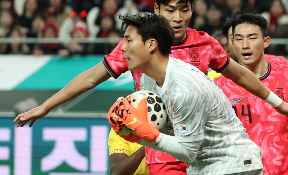 한국 축구 국가대표팀 골키퍼 송범근(앞)이 18일 서울월드컵경기장에서 열린 가나와의 평가전에서 두 손으로 공을 잡고 있다. 한국은 이날 송범근의 선방에 힘입어 1-0으로 무실점 승리를 거뒀다. 가나전에서 경쟁력을 보여준 송범근은 “월드컵 본선에서 주전으로 뛰고 싶다는 욕심이 생겼다”고 말했다. 뉴시스가나전이 열린 18일 서울월드컵경기장. 송범근은 킥오프 휘슬이 울리자 긴장감을 떨쳐내고 경기에 집중했다. 송범근에겐 2022년 7월 동아시아축구연맹(EAFF) E-1 챔피언십 홍콩전(3-0·한국 승)에서 A매치에 데뷔한 이후 무려 3년 4개월 만의 성인 대표팀 복귀전이었다. 이날 가나는 12개의 슈팅을 퍼부었지만, 송범근은 안정적으로 골문을 지키며 한국의 1-0 승리에 힘을 보탰다. 송범근은 “경기 전 대표팀 선배들이 ‘너라면 잘 해낼 거다. 재밌게 해봐라’라며 응원해줬는데 그게 큰 힘이 됐다”고 말했다.