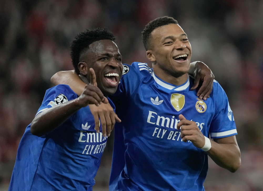 레알 마드리드의 킬리안 음바페(오른쪽)가 27일 열린 2025∼2026시즌 유럽축구연맹(UEFA) 챔피언스리그 올림피아코스와의 방문경기 후반 15분 네 번째 골을 넣은 후 환호하고 있다. 피레아스=AP 뉴시스