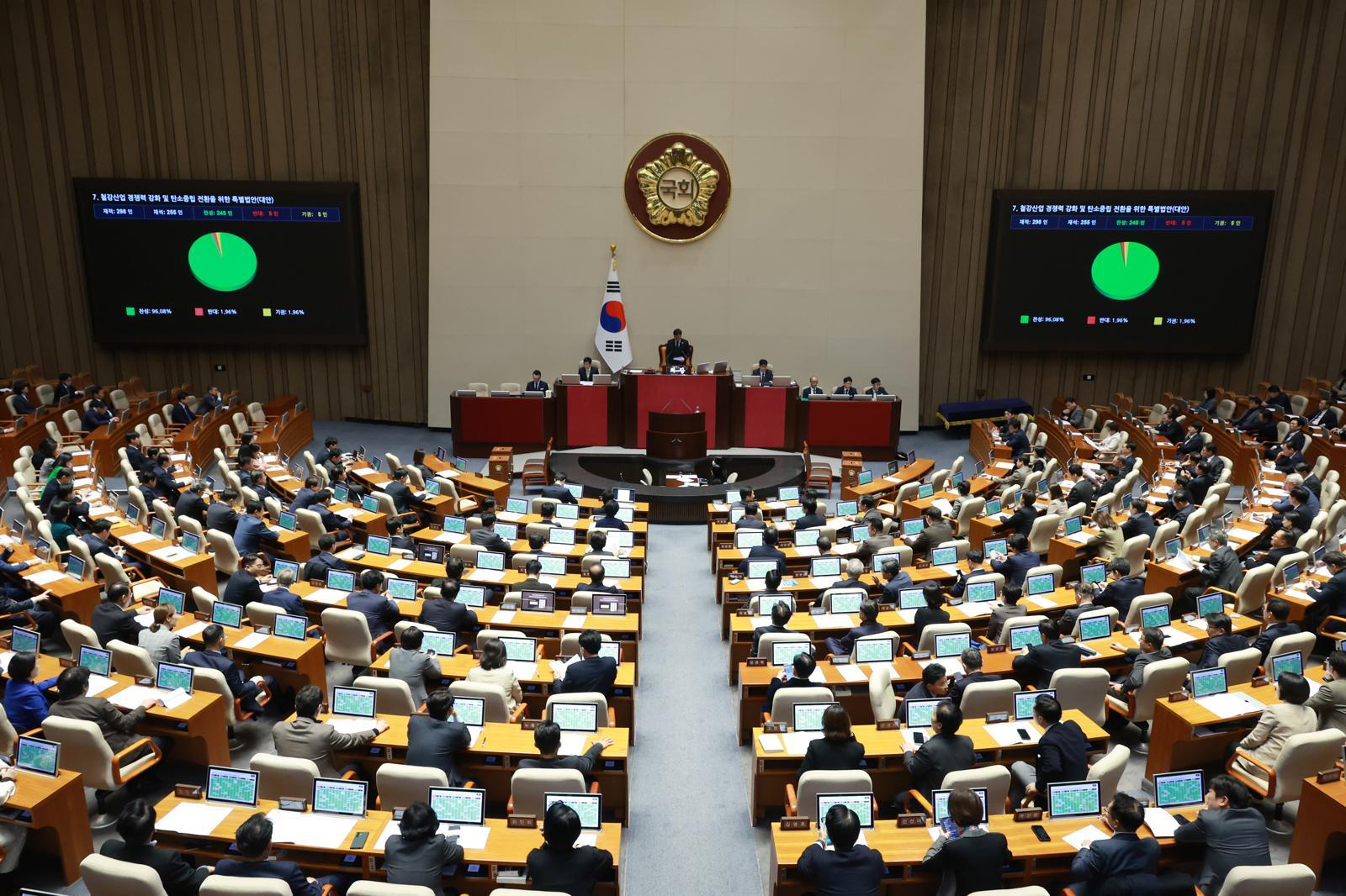 국회는 이날 본회의에서 K스틸법을 재석 의원 255명 가운데 찬성 245명, 반대 5명, 기권 5명으로 통과시켰다. 철강산업을 국가 경제 핵심 기반 산업으로 규정하고 기술 개발과 투자를 지원하는 것이 법안의 주요 내용이다. 미국의 철강 관세 50% 인상에 대응하기 위해 더불어민주당과 국민의힘 등 여야 의원 100여 명이 공동 발의했다. 법안은 공포 후 6개월 뒤부터 시행되며 2028년 12월 31일까지가 유효 기간이다. 만료 시점에 필요할 경우 최대 3년 범위에서 연장이 가능하다.