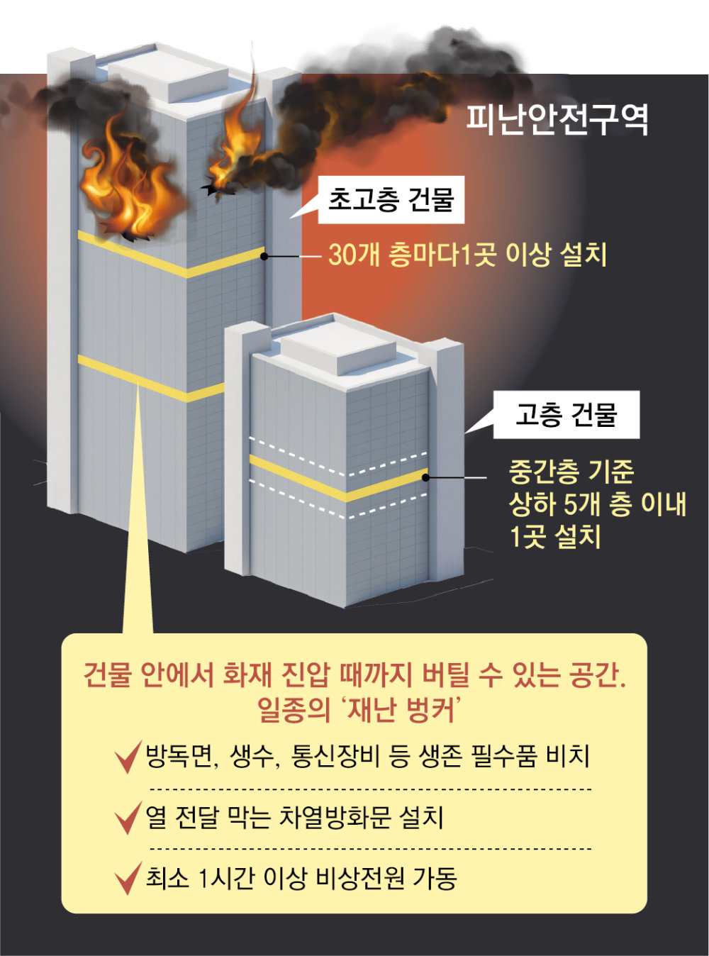 건물 내부에 있는 사람들이 대피할 수 있는 ‘피난안전구역’도 의무적으로 설치해야 한다. 초고층 건물은 30개 층마다 1곳 이상, 고층 건물은 중간층을 기준으로 상하 5개 층 이내에 설치하도록 돼 있다. 피난안전구역은 ‘재난 벙커’ 역할을 한다. 이곳으로 대피한 사람들이 화재 진압 때까지 버틸 수 있도록 설계돼 있다. 방독면과 비상 조명등, 생수 등이 비치돼 있고 열이 반대편으로 전달되는 것을 막는 차열방화문도 설치돼 있다. 고층 건물에는 일반 건물보다 더 많은 스프링클러가 설치돼 있다. 한국에서 가장 높은 롯데월드타워(555m)의 경우 스프링클러 16만 개가 있다.