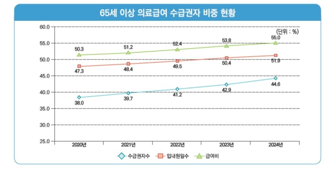 작년 의료급여 수급권자 중 65세 이상 수급권자의 비율은 44.6% 수준으로 나타났다. 65세 이상 비중은 2020년 38.0%를 기록한 뒤 2021년 39.7%, 2022년 41.2%, 2023년 42.9% 등 계속 높아지고 있다.