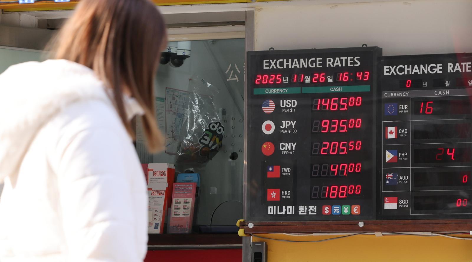 원·달러 환율의 고공행진이 계속되는 26일 서울 명동거리의 한 환전소에 원달러 환율 등 시세가 안내되고 있다. 2025.11.26/뉴스1
