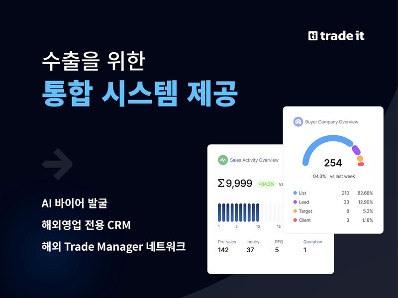 한편, 트레이드잇은 AI 기반 무역데이터 분석, 해외영업전용CRM, 해외 TM 네트워크를 결합해 중소기업의 수출 성공률을 극대화하는 Trade-as-a-Service(TaaS) 플랫폼이다. 무역데이터 기반 바이어 발굴 기술과 차별화된 솔루션을 활용해 중소기업의 해외 진출 과정을 데이터 기반으로 혁신하고 있다.