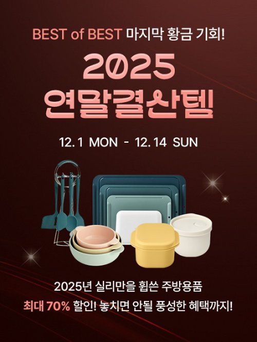 이번 ‘2025 연말결산’ 프로모션은 2025년 한해 동안 고객들에게 많은 사랑을 받았던 인기 실리콘 찜기 제품부터 TPU 도마세트 등 인기 제품만 모아 기획전을 꾸렸다.