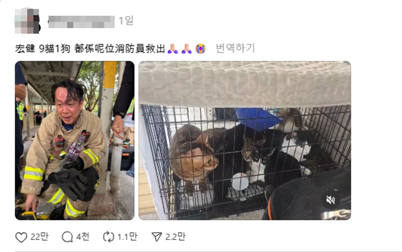 홍콩 타이포 ‘왕푹 코트(Wang Fuk Court)’ 아파트 대형 화재 현장에서 고양이 9마리와 개 1마리를 구조한 소방관의 사진이 온라인에서 폭발적인 반응을 얻고 있다. 사람뿐 아니라 반려동물까지 살려낸 소방관들의 활약이 알려지며 “진짜 영웅”이라는 찬사가 이어지고 있다.