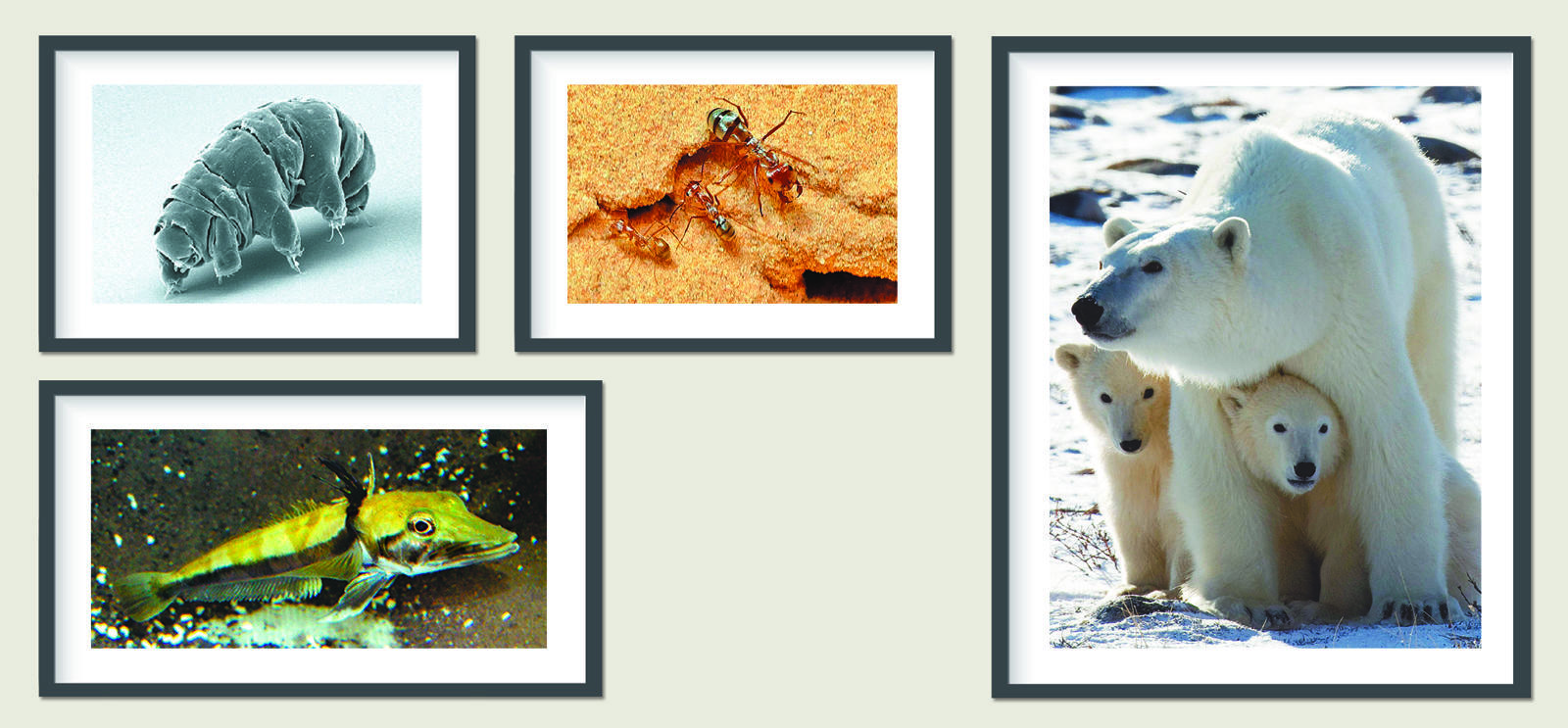 극한의 환경에서 생존하는 생명체들. 영하 273도의 절대 영도, 모든 것을 파괴하는 방사선과 진공 상태의 우주에서도 살아남는 슈퍼 히어로인 물곰. 지면 온도가 60도가 넘는 사막에서 1초에 1m를 달리는 사하라 개미. 북극곰은 매년 4∼8개월의 긴 겨울 내내 동면 없이 거의 파충류처럼 단식 상태로 견뎌낸다. 얼지 않는 혈액을 가진 아이스피시(윗줄 왼쪽부터 시계방향으로).