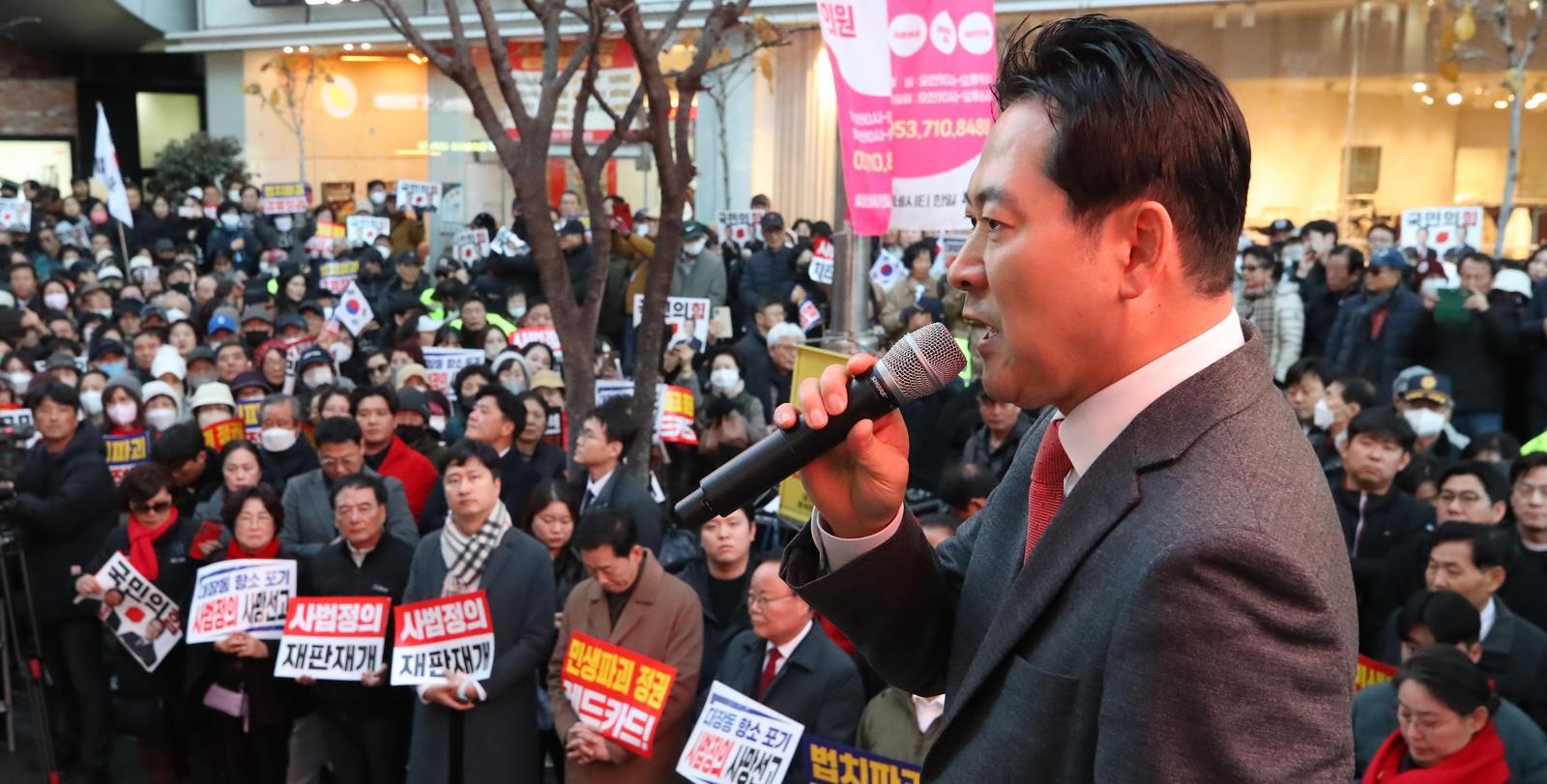 국민의힘 장동혁 대표가 28일 오후 대구 중구 동성로에서 열린 ‘민생회복 법치수호 대구 국민대회’에서 연설하고 있다. 대구=뉴스1