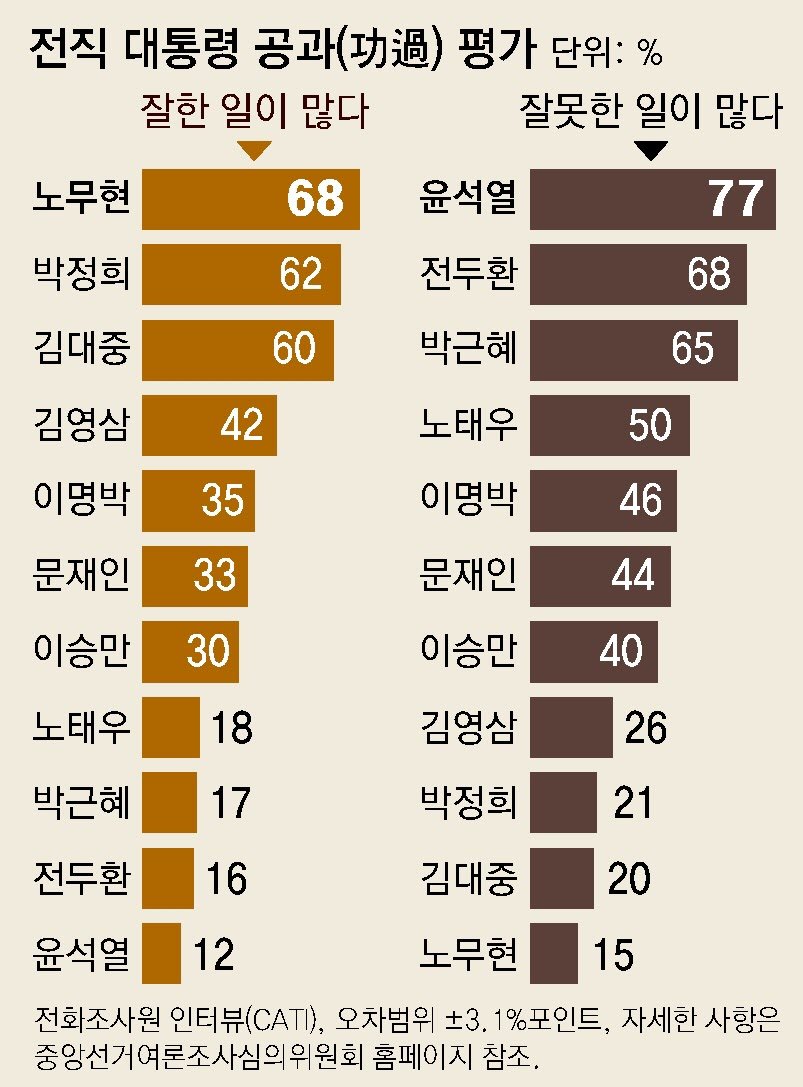 한국갤럽은 “2015년에는 박정희 전 대통령이 가장 높이 평가받았으나 지금은 노무현 전 대통령과 자리바꿈했다”며 “지난 10년 새 김영삼 전 대통령과 이명박 전 대통령에 대한 긍정론이 늘고 부정론은 줄어 재평가가 이뤄진 것으로 보인다”고 설명했다.