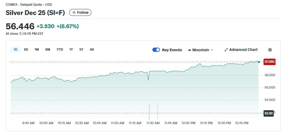 28일(현지 시각) 코멕스(COMEX)에서 은 선물은 6.67% 급등한 온스당 56.446달러를 기록했다. 이는 사상 최고치다.