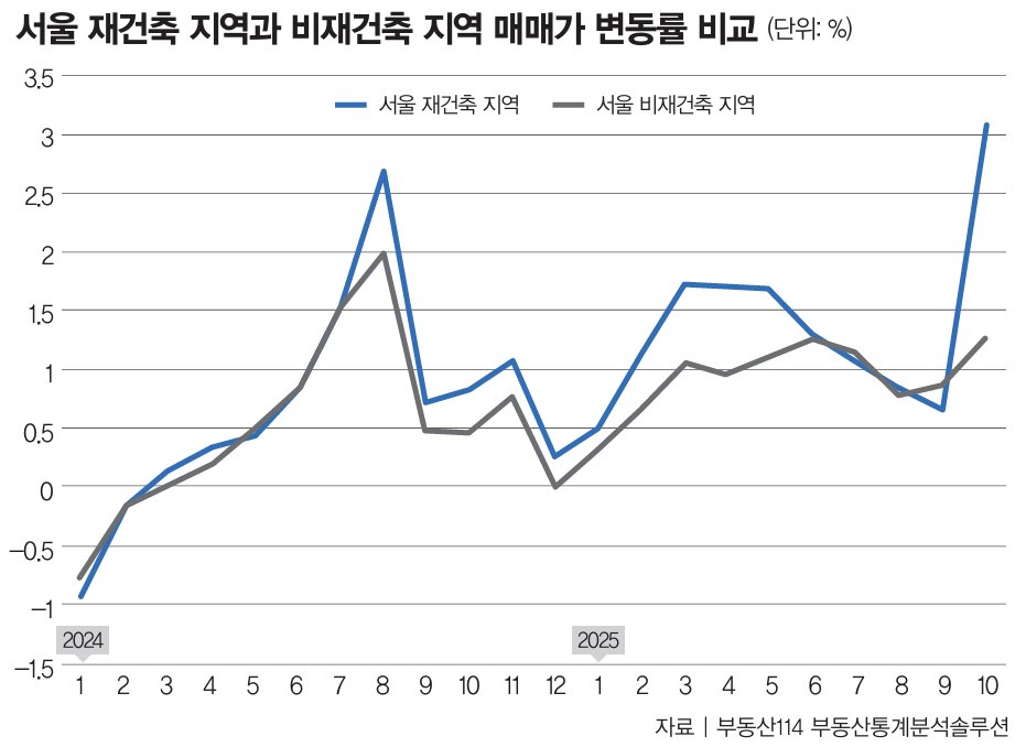 재건축·재개발 호재가 상승세 견인 KB부동산의 11월 전국 주택 가격 동향에 따르면 서울 아파트 매매가격은 전월 대비 1.72% 올라 2020년 9월(2.00%) 이후 5년 2개월 만에 가장 큰 폭으로 상승했다. 상승폭은 올해 최고 상승률을 기록한 지난달(1.46%)보다 더 컸다.