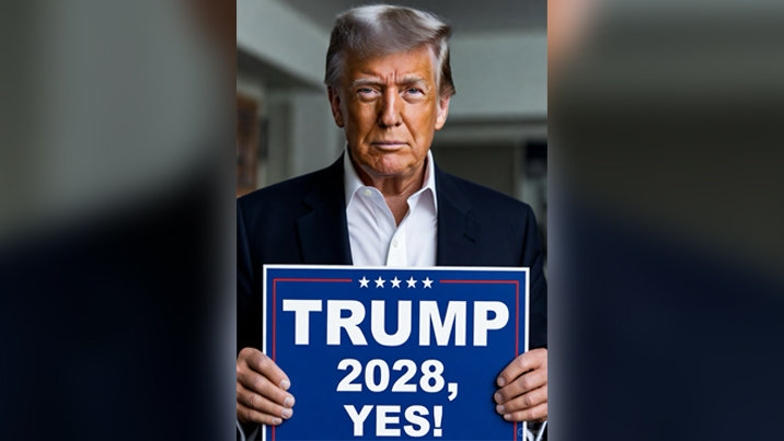 트럼프 대통령은 이날 트루스소셜에 인공지능(AI) 생성 이미지 한 장을 올렸다. 사진 속 트럼프 대통령은 미소를 지으며 양손으로 ‘TRUMP 2028, YES’라는 문구가 적힌 피켓을 들고 있다.