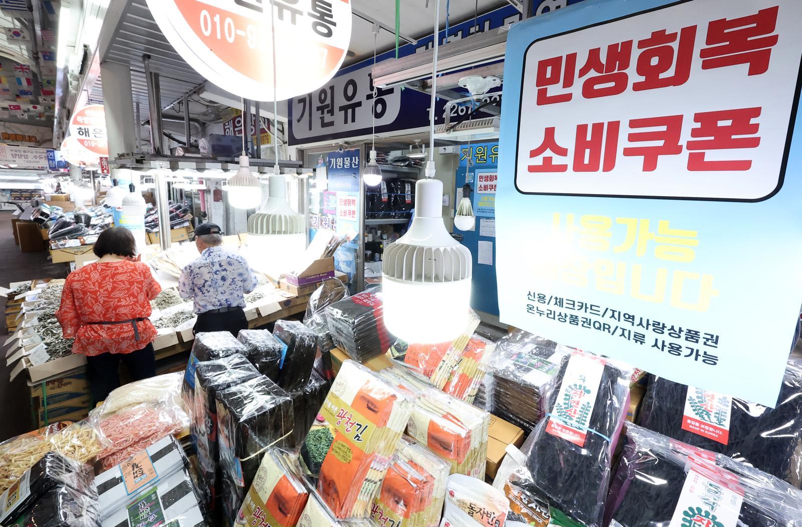 사진은 이날 오후 서울 중구 중부시장에 민생회복 소비쿠폰 사용 가능 매장 안내문이 부착되어 있다. 2025.8.26/뉴스1