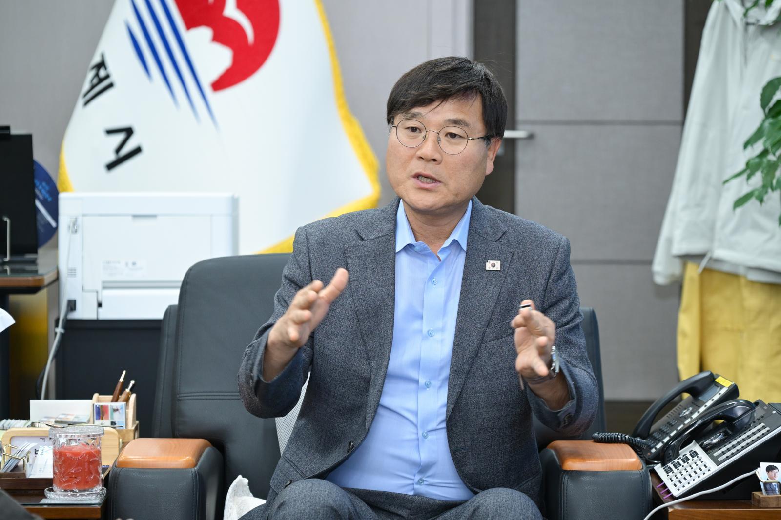 28일 경남 거제시청 집무실에서 변광용 거제시장이 동아일보와의 인터뷰 도중 “청년들이 떠난 자리를 외국인 근로자가 메우면서 조선업황과 지역 경기의 괴리가 심화되고 있다”고 설명하고 있다. 거제시 제공