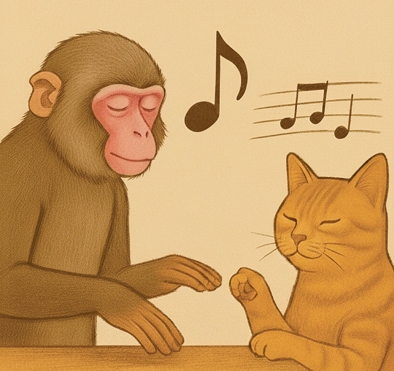국제학술지 ‘사이언스’에 실린 연구에 따르면 훈련받은 마카크원숭이는 음악 박자에 맞춰 손바닥으로 표면을 두드릴 수 있다. 개와 고양이가 클래식 음악을 들으면 더 빨리 안정된다는 연구 결과도 있다. 챗GPT·제미나이로 생성한 이미지.