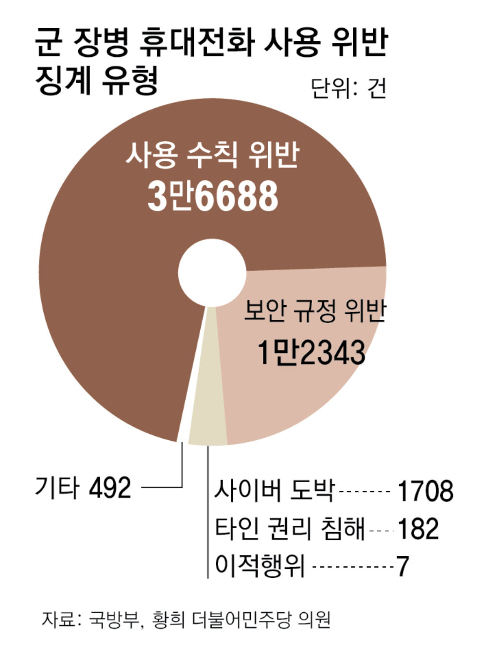 위반 사유 가운데 가장 많은 것은 ‘지정 시간 외 사용 등 기본 수칙 위반’(3만6688건)이었다. 이어 카메라 오남용 등 보안규정 위반(1만2343건), 사이버 도박(1708건), 동료 장병 촬영·유포 등 타인 권리 침해(182건), 온라인 이적 활동(7건) 순이었다.