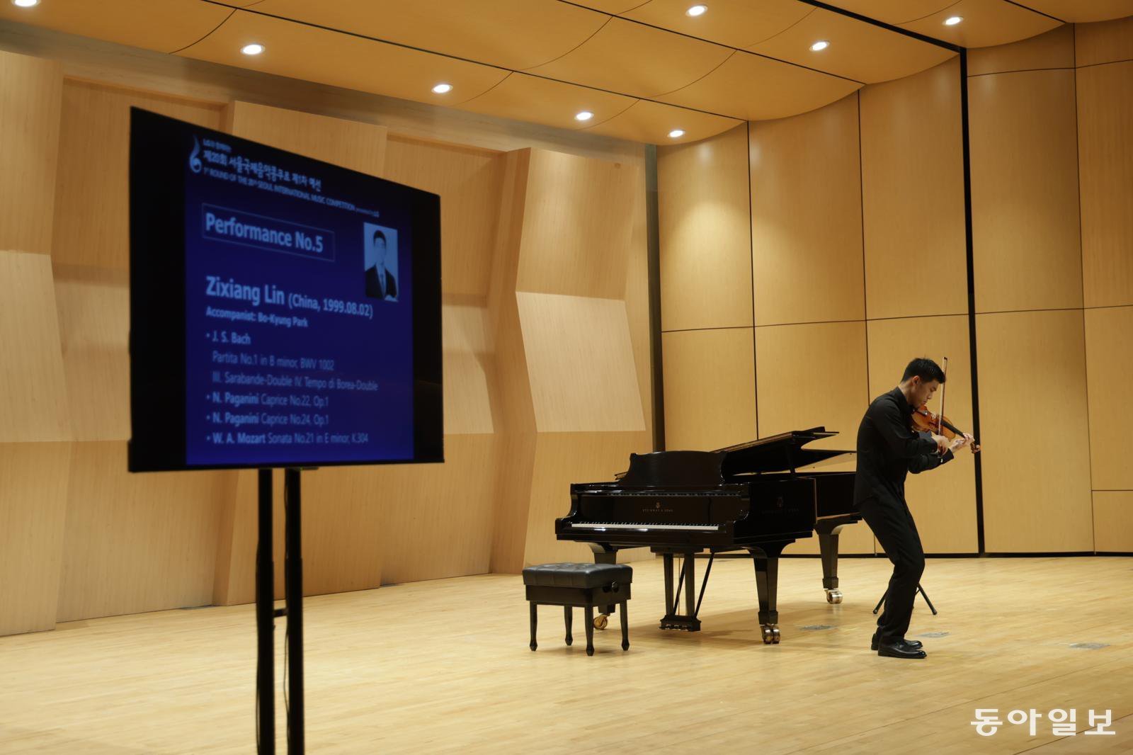 바이올린 부문으로 열리는 ‘LG와 함께하는 제20회 서울 국제음악콩쿠르’가 30일 서울교대 종합문화관에서 개막했다. 11월 30일∼12월 2일 열리는 1차 예선에는 예비심사를 통과한 20개국 103명이 출연한다. 30일 1차 예선에 참가한 린지샹(중국)이 바흐의 파르티타 1번을 연주하고 있다.