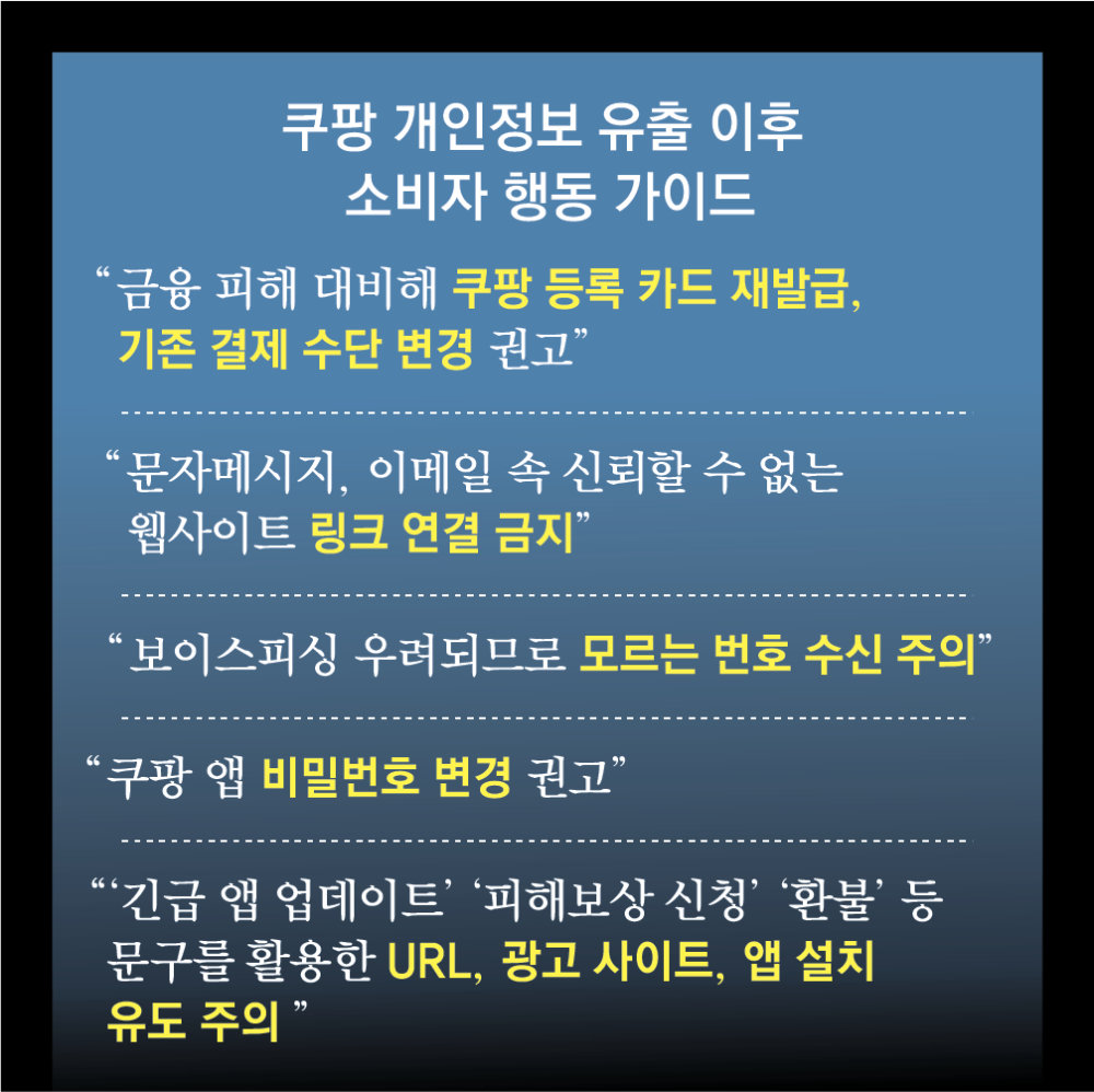 국내 이커머스 점유율 1위 업체 쿠팡에서 약 3370만 건의 고객 개인정보가 유출되면서 소비자들의 불안이 커지고 있다. 2차 피해를 우려해 등록된 결제수단을 삭제하거나 매월 자동 결제되는 ‘와우 멤버십’을 해지하는 움직임도 나타나고 있다. ‘늑장 통보’와 보상 공백 등 쿠팡의 대응을 둘러싼 불만도 이어지고 있다.