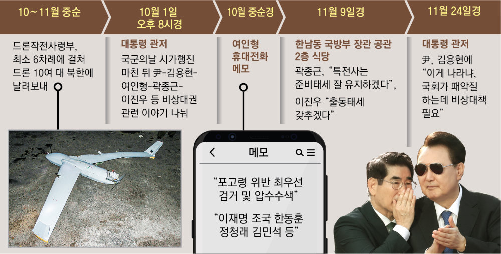 국군드론사령부는 지난해 10∼11월경 최소 6차례에 걸쳐 드론을 평양과 남포로 날려 보냈다. 특검은 윤 전 대통령이 계엄 선포를 위해 명분을 쌓으려 북한의 도발을 유도했다고 보고 일반이적 혐의로 그를 추가 기소했다.